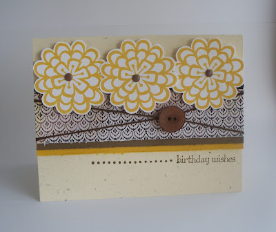 For my card I used the Stampin' Up! set "Garden Greetings". I love the bold outlines of this set. I stamped the flowers in Crushed Currry, and the sentiment in Soft Suede. I used DSP from BasicGrey which I think is a PERFECT match to the main pattern of the sweater. I cut 2 strips of card stock again in Crushed Curry, and Soft Suede, distressed the edges, and adhered them to the DSP. I accented the center of the flowers with brads by Karen Foster, and a button from Making Memories. I think my card matches the color, and design of the sweater in many ways, the DSP, the yellow buttons amd striped fringe on the collar. I am very pleased with my card! I am glad you stopped by to take a peek of my blog today, and hope you come back to visit!